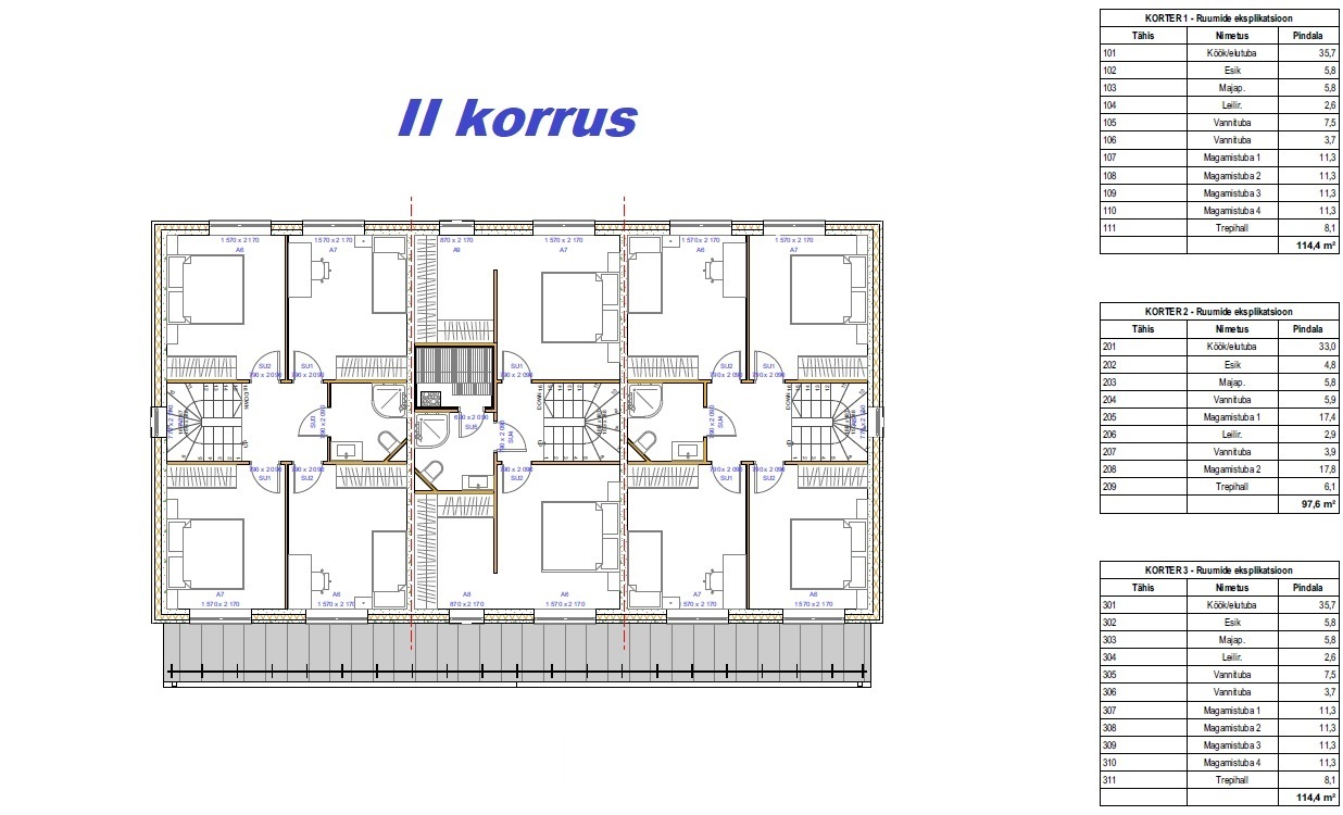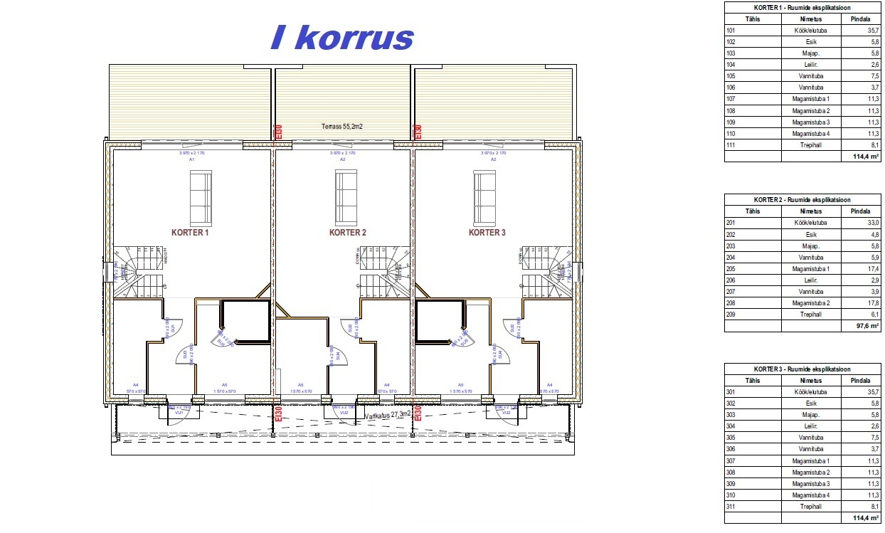 * 5-toaline ridaelamu Kõrve tn 21/1-1 kõetava pinnaga 114,4 m2 + terrass 18,1 m2 hinnaga 259 000 eurot.