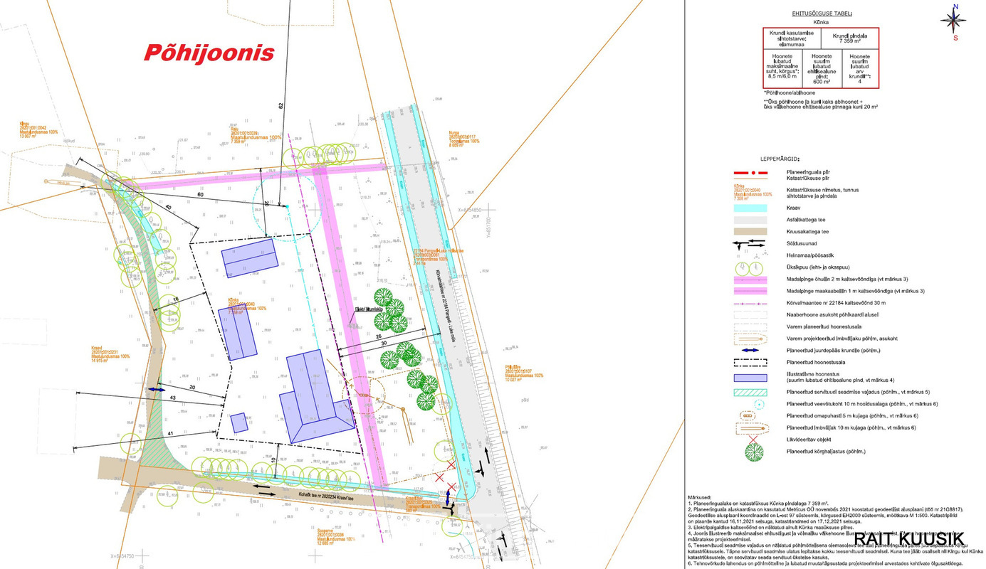 Müüdava kinnistu suurus 7361 m2. Olemas elektriliitumine 3 X 25 A. Vastavalt det.planeeringule on kinnistule lubatud ehitada üksikelamu ja kuni kolme abihoone ehitamine, sh on üks abihoone lubatud väikehoonena (kuni 20 m² ehitisealuse pinna ja kuni 5 m kõrgusena). Hoonete suurim ehitusalune pind kokku 600 m2. Hoonete lubatud maksimaalne kõrgus põhihoonel 8,5 m2 ja abihoonetel 6 m.